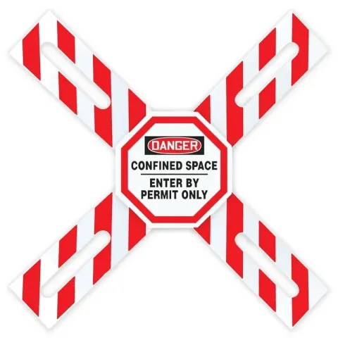 The crossbuck design fits onto the bolt pattern of a vertical confined space entrance.  The attention-getting diagonal red-white stripes and center octagonal sign features the color, layout, and confined space warning message as specified by OSHA/ANSI.  Adjustable crossbucks pivot flat for easy transport and storage.  The 11-1/2" x 11-1/2" octagon sign is printed on plastic.  Each arm of the printed crossbucks measure 6" x 42" with 1-1/2" x 9" slotted cutouts at the four ends to fit the bolt pattern across the entry-way - fits 22" to 38" outside bolt-to-bolt.