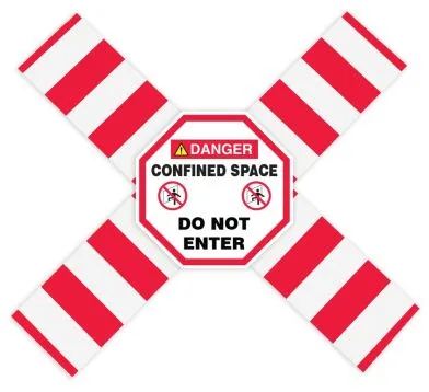 Attach and secure cross out with OSHA warning message over a confined space open hatch. The adjustable cross arms are designed to fit a variety of hatch openings, features 4-arm radial fit U-shaped flange ends to hook onto outer edge of opening. Adjust the flange to fit, then secure lockout tag with padlock through center post alignment holes. Barrier is heavy weight aluminum construction, and includes padlock and lockout tags (5).