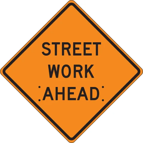 • The STREET WORK (W20-1) sign serves as a general warning of obstructions or restrictions and should be located in advance of the work space or any detour on the road where the work is taking place