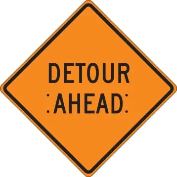 In compliance with MUTCD Section 6F.18 The DETOUR (W20-2) sign should be used in advance of a road user detour over a different roadway or route This sign has snaps to accommodate overlays to change messages Quick to set up and easy to take down and store Lightweight, flexible fabric Highly visible orange signs with contrasting black messages and symbols Designed with four corner pockets to insert cross-ribs (sold separately)