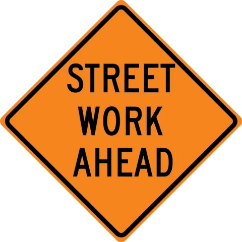- The STREET WORK (W20-1) sign serves as a general warning of obstructions or restrictions and should be located in advance of the work-space or any detour on the road where the work is taking place