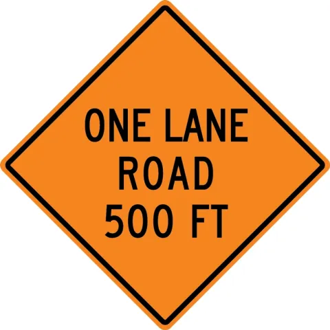 - Inform drivers of a one lane road either ahead, in 500-ft., in 1000-ft., or in 1/2 mile.