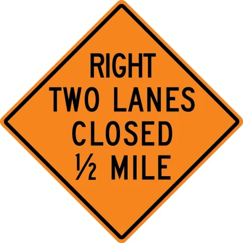 Inform drivers the right two lanes are closed ahead or in 500ft., 1000ft., or 1/2 mile