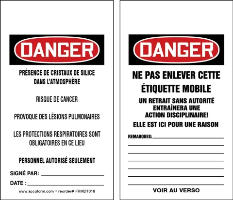 Accuform FRMDT018PTP OSHA Danger Safety Tags: Respirable Crystalline Silica May Cause Cancer - Causes Damage To Lungs - Wear Respiratory Protection In This Area