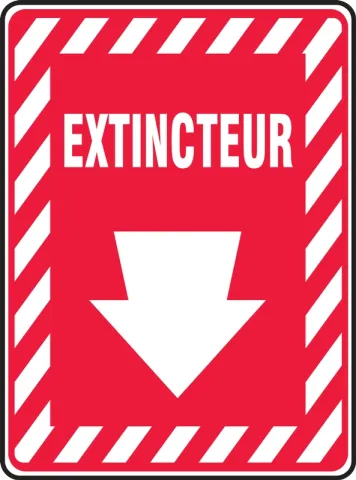 - Red and white sign with bold arrow draws attention to the location of a fire extinguisher.