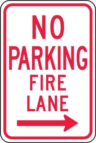 - Identify fire lanes where drivers cannot park with this sign including a right arrow.