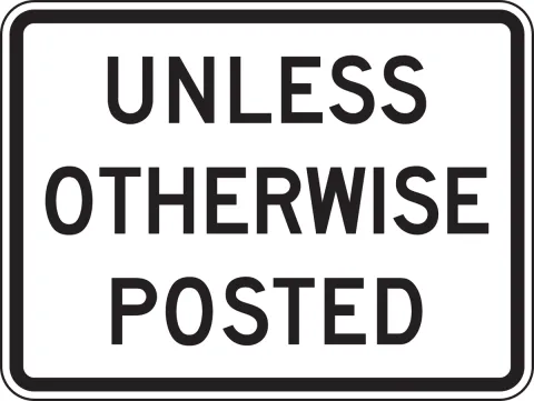 - A UNLESS OTHERWISE POSTED (R2-5P) plaque may be mounted below the Speed Limit sign if a jurisdiction has a policy where signs are applicable to large areas such as cities or neighborhoods