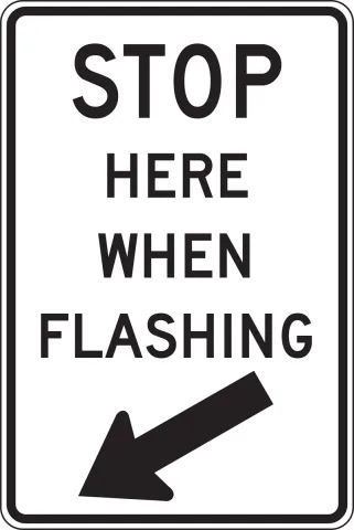 - STOP HERE WHEN FLASHING (R8-10) sign may be used at a grade crossing to inform drivers of the location of the stop line or the point at which to stop when the flashing-light signals area activated