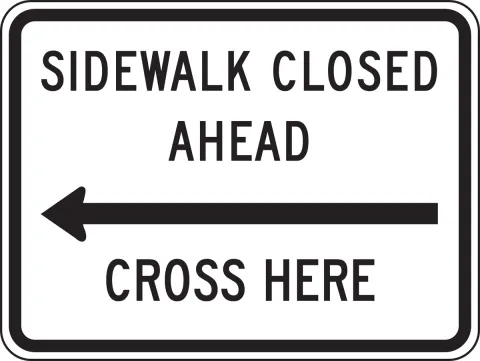 - The SIDEWALK CLOSED AHEAD, (ARROW) CROSS HERE (R9-11) sign should be used to indicate to pedestrians that sidewalks beyond the sign are closed and to direct them to open crosswalks or sidewalks