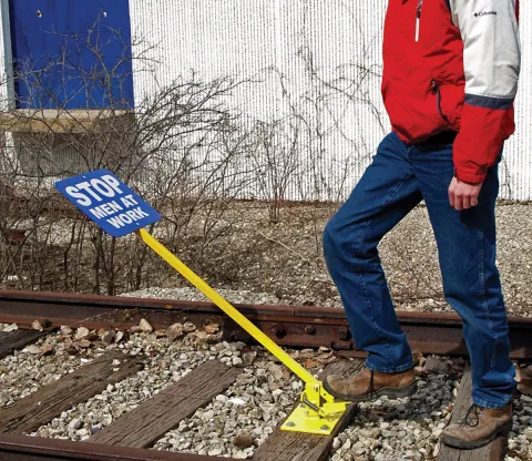 Foot-Operated Hinged R.R. Sign Holder Simply step down on the pedal to make the spring-action holder fall below rails. To raise the sign holder, step down on the roll pin, causing the holder to rise up vertically so you can lock it in place. Lag screws included. Powder-coated yellow finish. Weight: 12lbs. Sign sold separately.