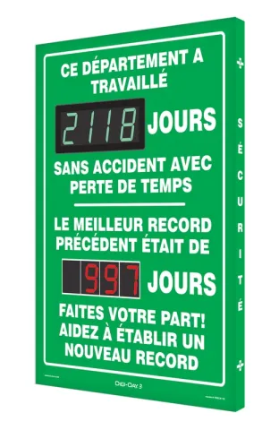 - Displays count days without an accident in green, and if a lost time accident occurs, set the display back to red until you meet your new safe-days goal