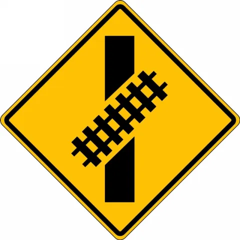 - The Skewed Crossing (W10-12) sign may be used at a skewed grade crossing to warn road users that the tracks are not perpendicular to the highway
