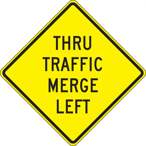 - The THRU TRAFFIC MERGE LEFT (W4-7) sign should be used in advance of an intersection where one or more lane closures require through vehicular traffic to use the left lane to proceed
