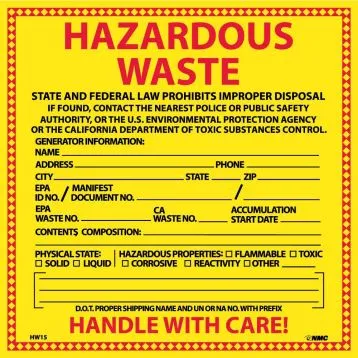 NMC HW16 6" x 6" Hazardous Waste California Hazmat Label Yellow Pressure Sensitive Vinyl