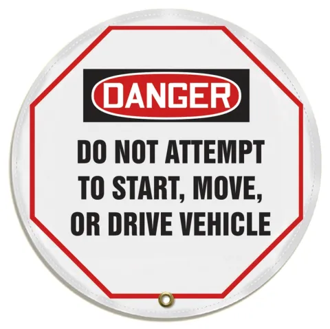 The reinforced vinyl cover has a screen-printed warning legend and message, and fits over standard steering wheels to be seen. The upper half has a stitched pocket to slip over the steering wheel. The bottom has a 3/8" metal grommeted hole to accommodate a 1 1/2" hasp or padlock (sold separately) securing the cover to the steering wheel. Availale in 16", 20" & 24".