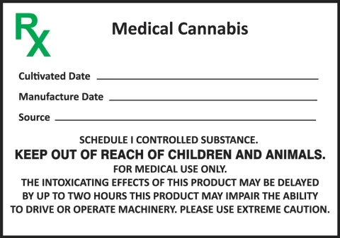 State Compliant Rx labels clearly mark content and important dates for medicinal cannabis.