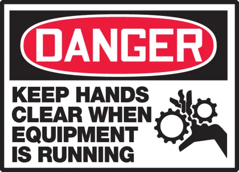 OSHA-compliant label with graphic warns worker to keep hands away from running equipment.