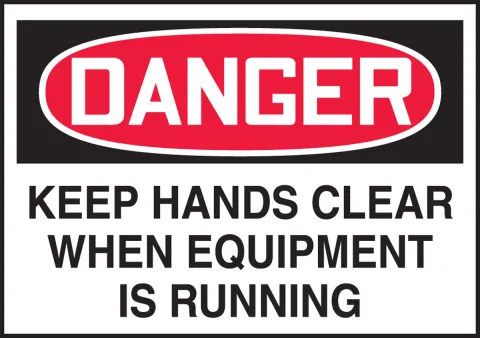 OSHA-compliant label will help reduce hand injuries around running equipment.