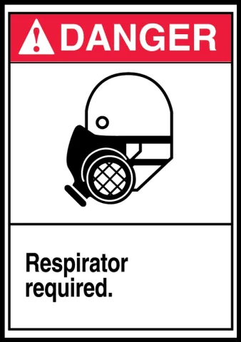 Sign features large respirator graphic