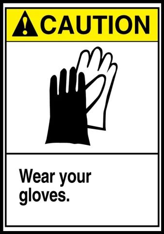 ANSI-style safety label reminds employees to wear gloves to prevent hand injuries.
