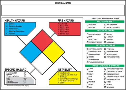 One label combines the specific chemical and human body hazard information. Write in the NFPA hazard codes in the diamond spaces and check off the list for: route of entry; health hazards; physical hazards; and target organs and effects.