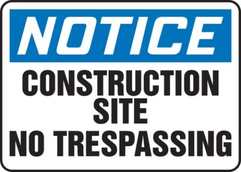 Prevent unauthorized personnel from trespassing on your construction siteBlue OSHA-styled Notice header captures attentionTraditional OSHA-style signs, tags and labels are the most widely recognized design format in the industryNotice header indicates information considered to be important but not hazard-related
