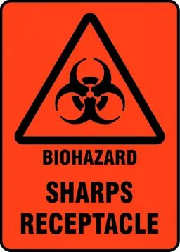 Label sharps receptacles as a biohazard to prevent skin puncture and infection.Place this sign near all sharps receptacles Ensure all staff members are made aware of biologically hazardous contents to prevent infection Get the point across to all employees with the universally recognized biohazard symbol Material: Aluminum Size: 10" x 7" Language: English Color: Black/White Background Color: Blue