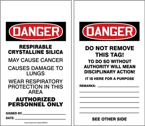 Accuform MDT018CTM OSHA Danger Safety Tags: Respirable Crystalline Silica May Cause Cancer - Causes Damage To Lungs - Wear Respiratory Protection In This Area