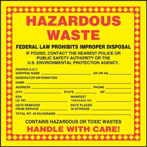 Mark Hazardous waste with a quality label and ensure waste is disposed of properly. Inform readers of a federal law involving hazardous waste disposal Urge users to handle product with care Label drums and containers to identify hazardous contents and promote safe handling and transport Eliminate the uncertainty of accumulated contents in containers by marking them Be aware of the potential for harmful waste contained within Labels with peel-off liner available in: Adhesive Coated Paper for short term use in protected areas; and Adhesive-Poly Sheet for moisture and weather exposure areas Package of 25; Package of 100; and Roll of 250 Cost effective in high quantities Matte surface can be easily written on with pen or pencil 60-lb. paper Coated on the back with permanent acrylic adhesive with peel-off liner Available in any standard background color and select fluorescent backgrounds Material: Adhesive Coated Paper Size: 6" x 6" Unit of Measure: 25/PK Weight: 0.345 lbs