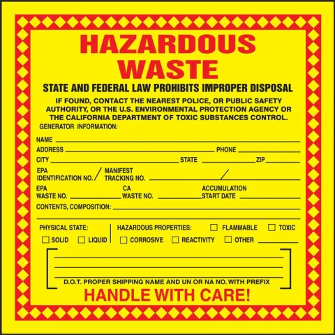 Labels help meet D.O.T. (49 CFR part 172) and EPA (40 CFR part 262.31-32) regulations for labeling substance containers for hazardous waste. Specifications do not include size or color of labels; however, regulations do require that the labels be durable, in English, written sharply, and in contrasting colors.