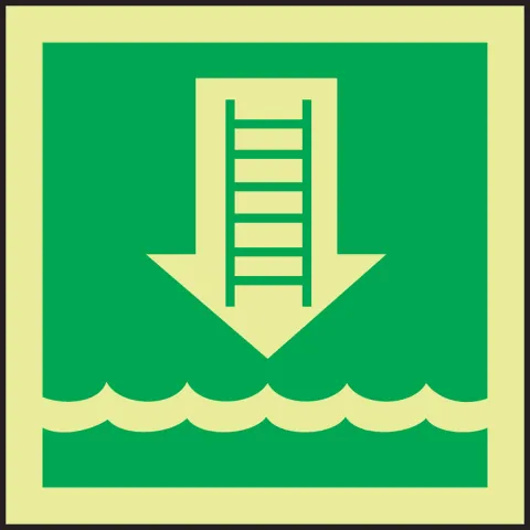 Notify all readers of embarkation ladder used to board or disembark a vessel. Notify passengers of the location of a embarkation ladder Glow signs ensure signage is visible in minimal light conditions IMO Safety Signs contain symbols for immediate recognition of instructions, directions, and identification to the crew, workforce, contractors, visitors, and public in an on-board emergency Made of .060" bonded polycarbonate to be impact-resistant Signs are visible in light and dark with green-yellow glow surface Suitable for both indoor and outdoor usage and available as flexible self-adhesive and plastic sign Both materials have the surface sealed with a UV protective coating to protect the image against fade, dust, dirt, and splash Flexible self-adhesive photoluminescent polyester Printed surface is protected with UV-resistant overlaminate film Permanent acrylic adhesive coated underside with peel-off liner Resistant to abrasions, moisture, various chemicals and solvents, and fading from UV sunlight Service temperature range -30 to 175 F