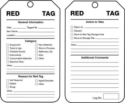 Use during the "sort" stage of 5S, so items with a questionable status could quickly be tagged and moved to a designated area for later evaluation. Easy and quick way to keep your facility organized and safe.