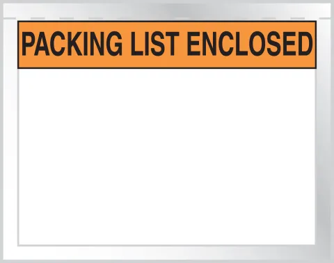 Packing list envelopes protect shipping documents from moisture, greases, and tampering. These 2-mil flexible polyethylene plastic envelopes have slit-back on one side to slip in the paperwork. The pressure-sensitive back has peel-off liner to adhere to nearly all packaging surfaces - paper board, wood, plastic and metal. Press onto package to seal in and safeguard the documents. Typically, documents cannot be removed without cutting, tearing or stretching the envelope. Print is bright, easy to see, contrasting colors.