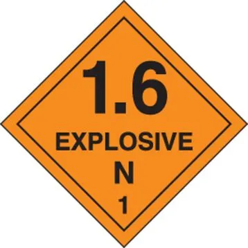 Consists of extremely insensitive articles which do not have a mass explosive hazard.This division is comprised of articles which contain only extremely insensitive detonating substances and which demonstrate a negligible probability of accidental initiation or propagation.Provide U.S. DOT (U.S. Department of Transportation) definitions for each hazmat placard used in transportation.Title 49 of the United States Code of Federal Regulations (49CFR) requires the use hazardous materials placards when shipping hazardous materials cargo and dangerous goods in the United States.Canada, Mexico and many other countries have similar regulations that also require the use of these placards.Material: Adhesive PolySize: 4" x 4"