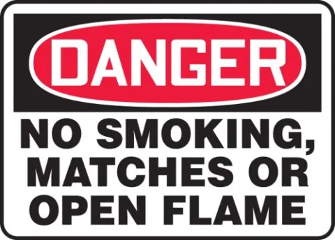Warns employees that smoking or open flame of any kind will not be allowed in this area.