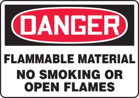 Cautions workers not to smoke or have open flames where flammable material is present.