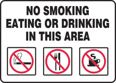 Warns passersby that smoking, eating, and drinking will not be permitted here.