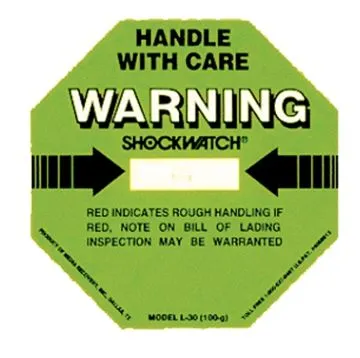 Label has visual indicator which changes from clear to red if excessive impact occured to the package. This label device senses and indicates a magnitude of shock, featuring a tiny liquid-filled tube on a 3 3/4" octagonal label. Normal movement or road shock will not activate the indicator - only the specific impact for which it was designed to detect. Unaffected by moisture or normal temperatures, once activated, the device cannot be reset.