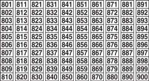 Eliminate the need to create multiple digit numbers by lining up single digit numbers side-by-side. Come in series of 100 (series 901-999 has one less per set).