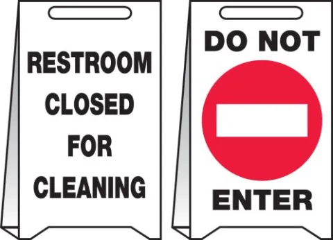 A single sign can be used for both indicating a closed restroom, or to block an area.
