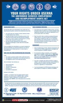 Employers must post the USERRA (Uniformed Services Employment and Reemployment Rights Act) notice in the workplace informing employees of their rights. This law protects employment and re-employment rights and benefits of the military service members upon their return to civilian life.