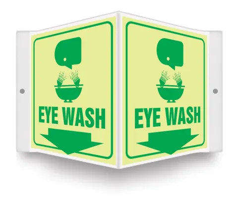 Inform all personnel of the location of an eye washing station in a facility. Properly mark the location of an eye washing station Product comes in 3D or 90D styles Glow material helps improve safety during power loss Projection styles allow for greater visibility from more angles 3D Signs project at 45 degree angle providing viewing from the front and sides 90D signs project from the wall at 90 degrees and can be viewed from either side Can be mounted with Tapes and Screws, not included Photo-luminescent film permanently bonded to semi rigid and impact resistant plastic Rounded corners and 3/16" mounting holes on most sizes, will be adjusted for larger sizes Polycarbonate service temperature range: -20° to 149°F Style: 3D (6" x 5" Panel) Material: Lumi-Glow™ Plastic