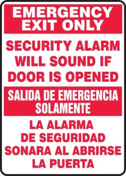 14" x 10" Bilingual Safety Sign: Emergency Exit Only - Security Alarm Will Sound If Door Is Opened, Aluma-Lite