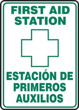 10" x 7" Bilingual Safety Sign: First Aid Station, Adhesive Dura-Vinyl
