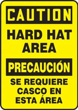 14" x 10" Bilingual OSHA Caution Safety Sign: Hard Hat Area, Dura-Plastic