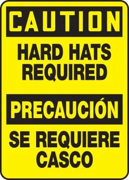Accuform SBMPPA640XT 14" x 10" Bilingual OSHA Caution Safety Sign: Hard Hats Required, Dura-Plastic