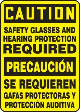 14" x 10" Bilingual Spanish Caution Safety Sign: Safety Glasses And Hearing Protection Required, Plastic