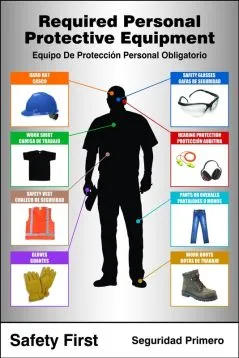28" x 20" Construction Site PPE-ID Sign: Required Personnel Protective Equipment, Bilingual - Spanish/English