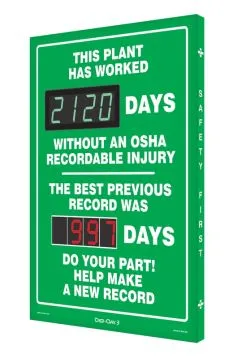 28" x 20" Digi-Day Electronic Safety Scoreboards: This Plant Has Worked ____ Days Without An OSHA Recordable Injury - The Best Previous Record Was ____ Days, Aluminum Face