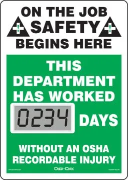 Celebrate Days without an OSHA Recordable Accident with Mini Digi-Day® Electronic Scoreboards Every day counts with a versatile scoreboard that fits perfectly in a variety of settings. The Mini Digi-Day® Electronic Scoreboard is an excellent way to make a safety a priority in your workplace and track days without an OSHA recordable injury. This compact and cordless safety scoreboard can be displayed on a desktop, shelf, table, wall, or any indoor space to promote safety awareness. It is ideal for office environments such as the front lobby, reception desk, and customer service areas. The Mini Digi-Day® Electronic Scoreboard shows that safety counts in your workplace.